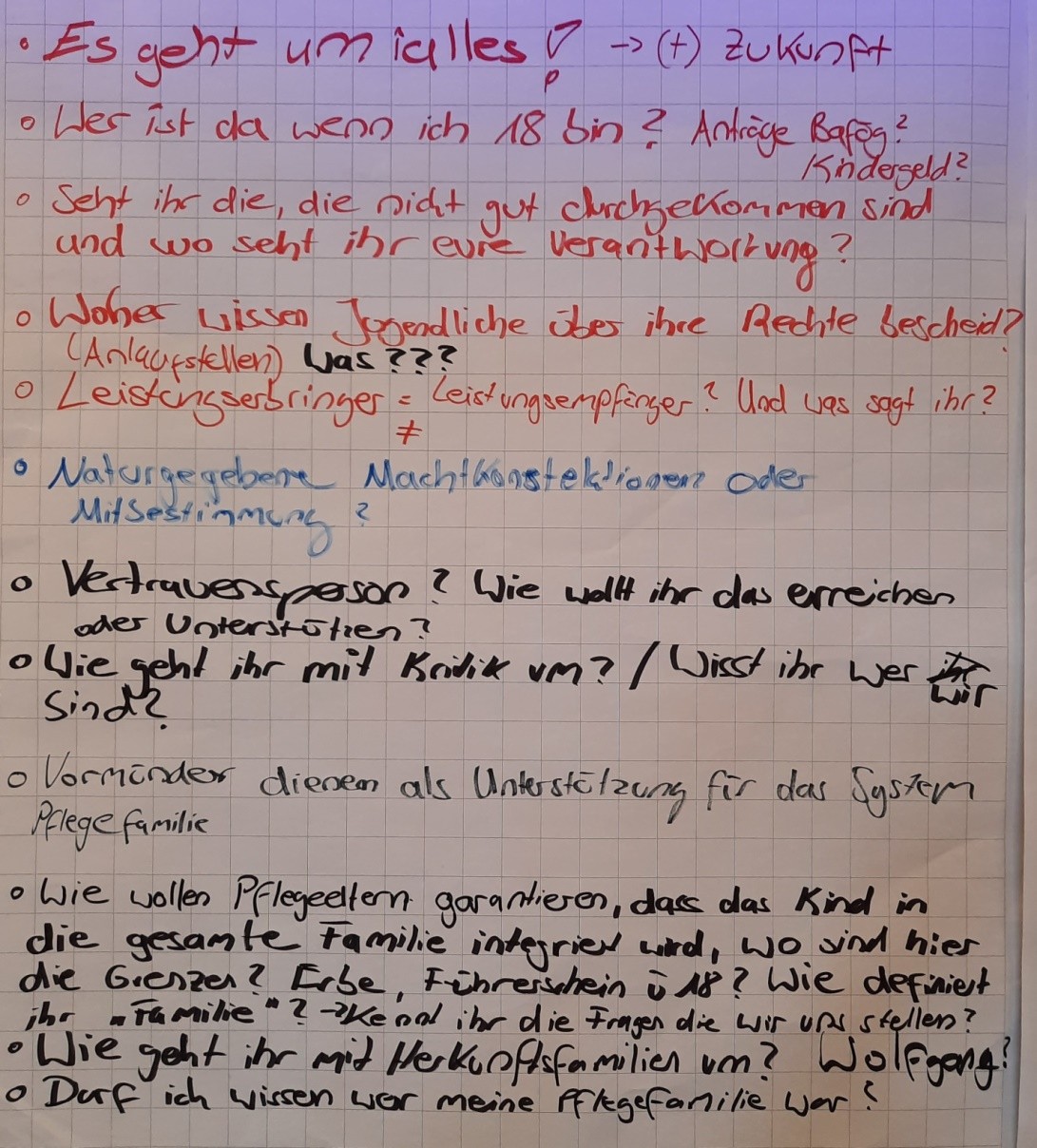 Drei der jungen Menschen brachten eigene Beiträge ein, ein Rollenspiel zur Hilfeplanung, eine Aufstellung und einen Bericht über Erfahrungen mit dem Vormund. Aus diesen Erfahrungen und einer Gruppenarbeit, in der die drei Gruppen getrennt arbeiteten, entstanden Thesen. Die erste lautet: „Gute Zusammenarbeit bedeutet, Raum dafür zu schaffen, dass das Kind gesehen wird und seine Bedürfnisse ausdrücken kann.“ Junge Menschen hatten berichtet, häufig erfahren zu haben, dass sie nicht gehört werden, Pflegeeltern und Vormund:innen waren nicht immer sicher, ob und was sie von Kindern und Jugendlichen erfahren.